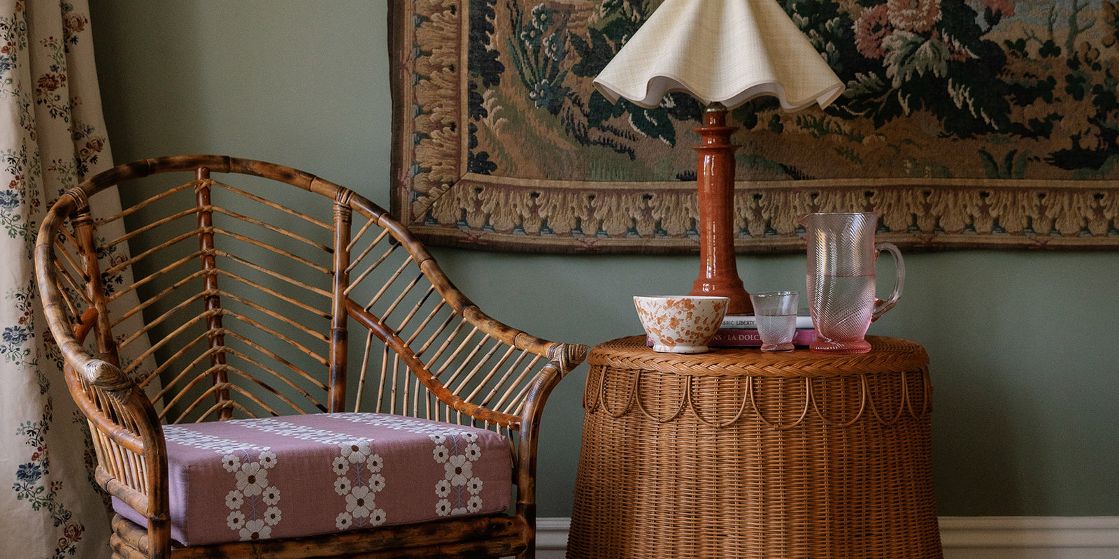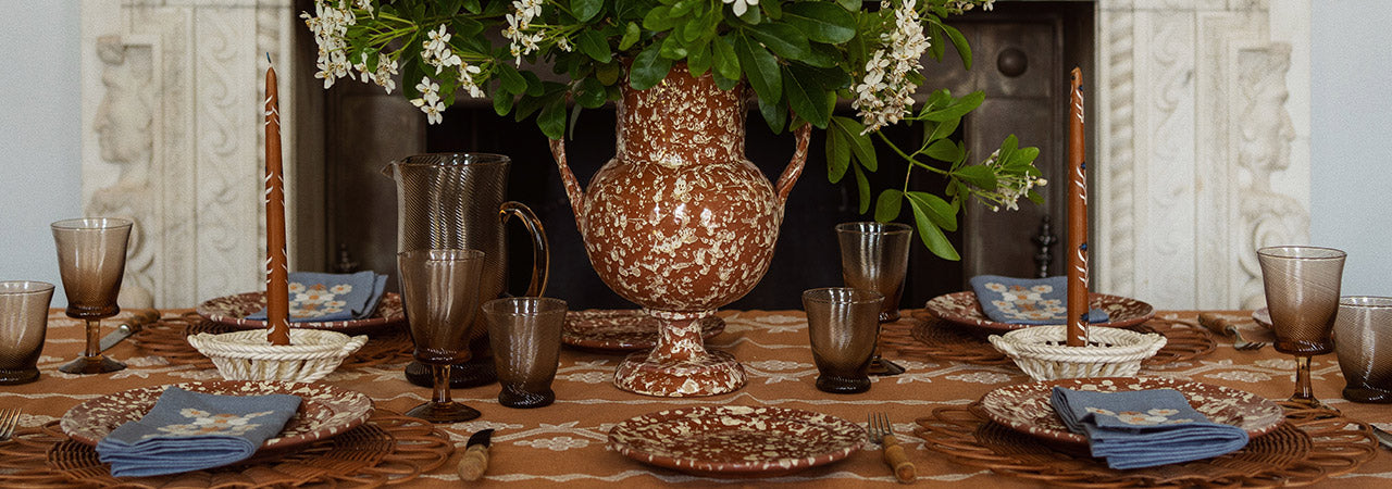 Sharland England’s world features future heirlooms full of personality, like rustic ceramics dotted with motifs that reference an antique terracotta fragment Louise found during her travels; napkins and cushions with embroidery inspired by vintage Anatolian needlework; and all-natural, handwoven rattan tables whose gentle, undulating curves echo draped fabric.